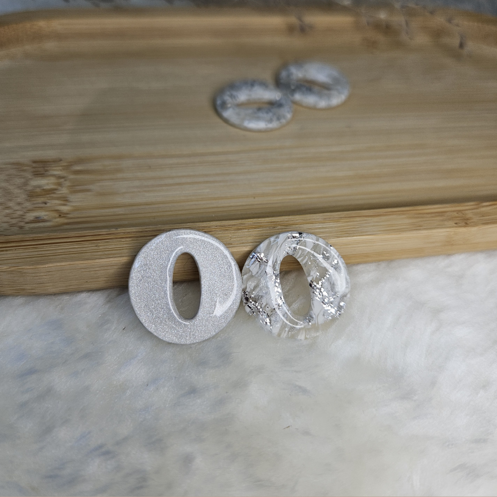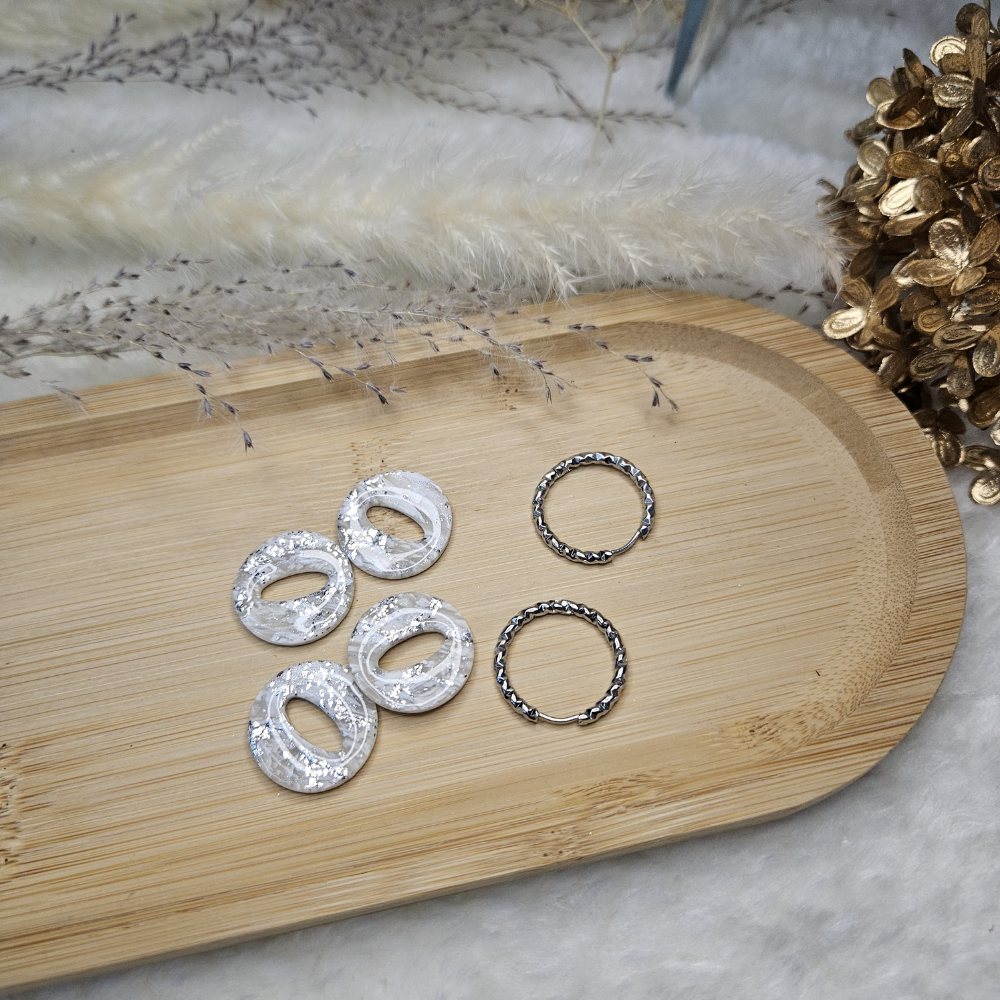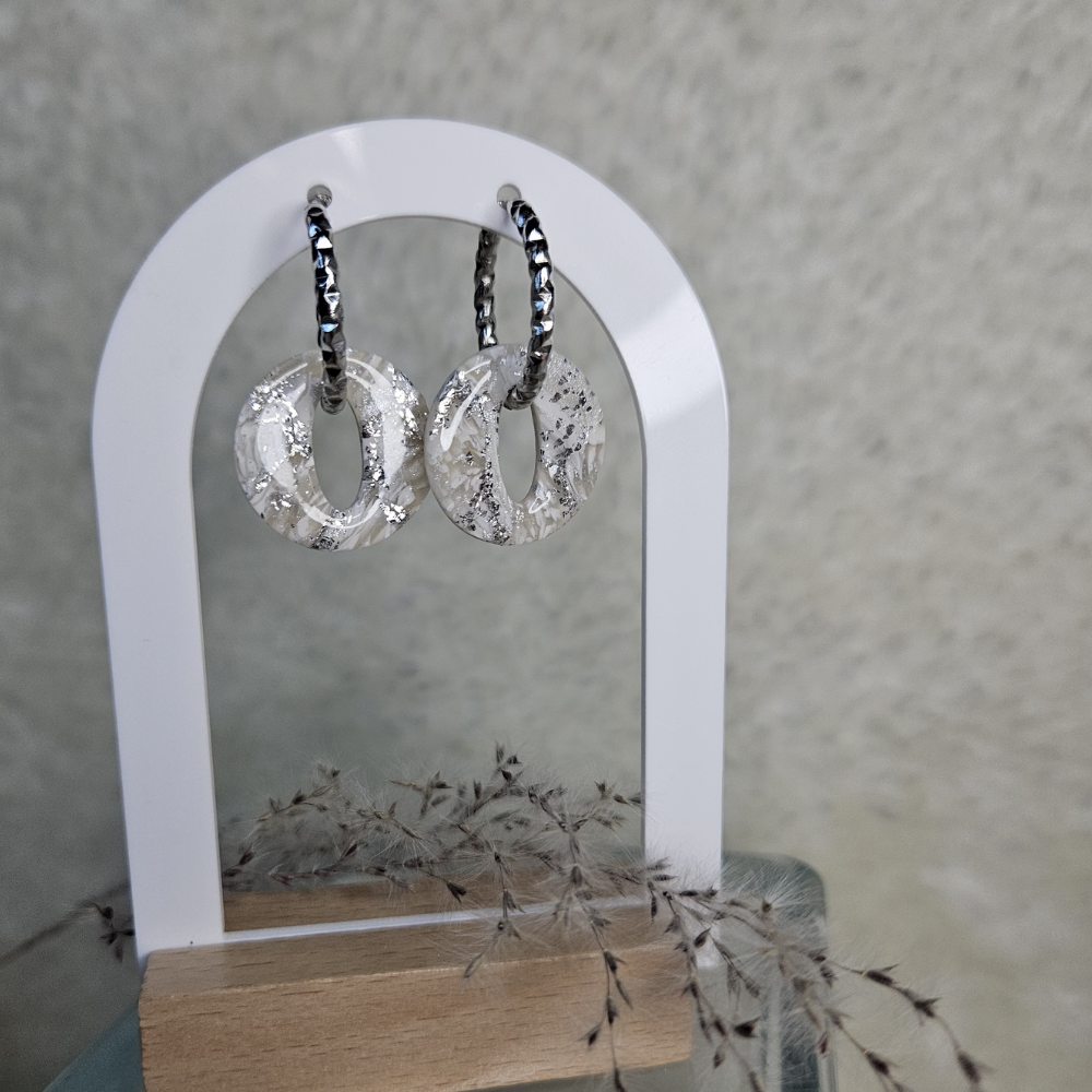 Déclinaison des pampilles Olivia (petit format), en marbré blanc et feuilles d'argent.