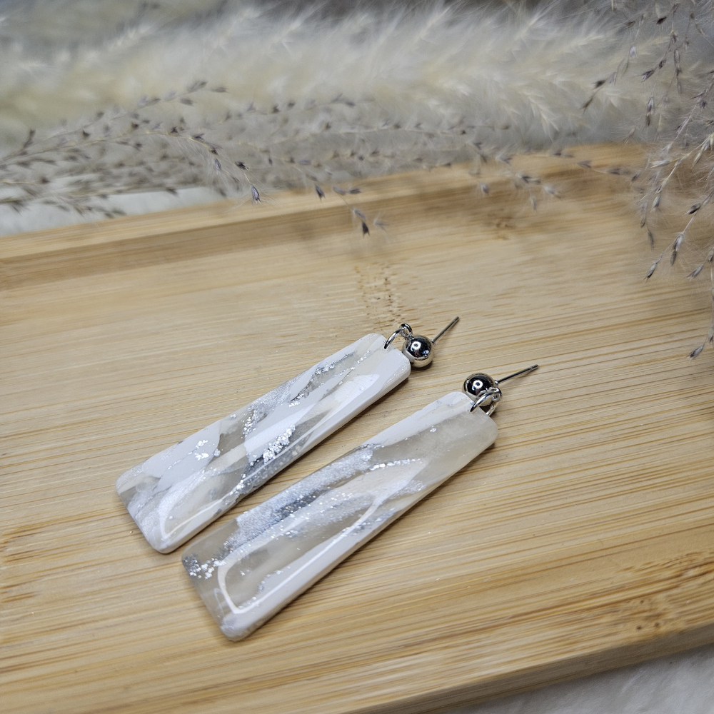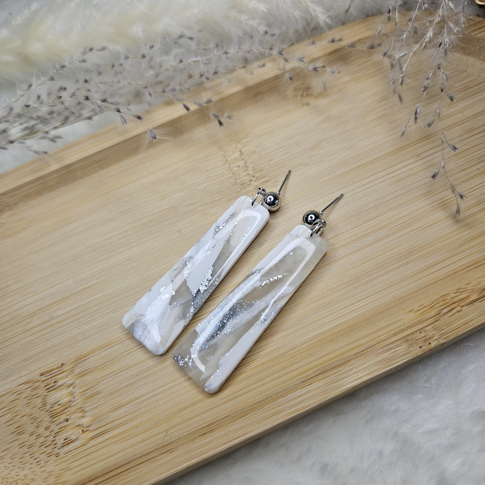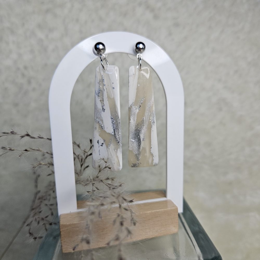 Magnifique paire de boucle d'oreille de forme rectangulaire, marbré blanc, gris, argenté et beige.